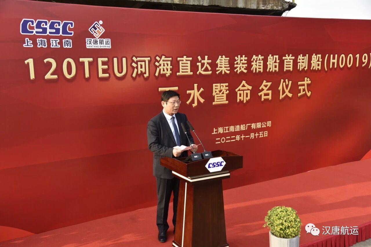 上海市交通委副主任叶兴先生在致辞中表示,刚刚胜利闭幕的中共二十大报告明确提出要“加快建设交通强国”,这是对我们交通行业战线所有人员提出的历史要求,也是我们光荣的历史使命。上海汉唐航运有限公司多年来一直积极参与并推动中国河海直达航运事业的突破与发展,是国内第一家建造河海直达集装箱船舶的航运企业,为上海乃至全国港口集疏运体系优化提供了新的解决方案和路径,为中国水路运输行业做出了积极贡献。河海直达船型也是上海港提升内河运输比例、推动“公转水”、优化运输结构的有力抓手。作为河海直达龙头企业,希望汉唐航运抓住历史机遇,加快做大做强河海直达水路运输服务网络,为上海港运输结构调整和长三角水路运输高质量发展做出更大贡献。