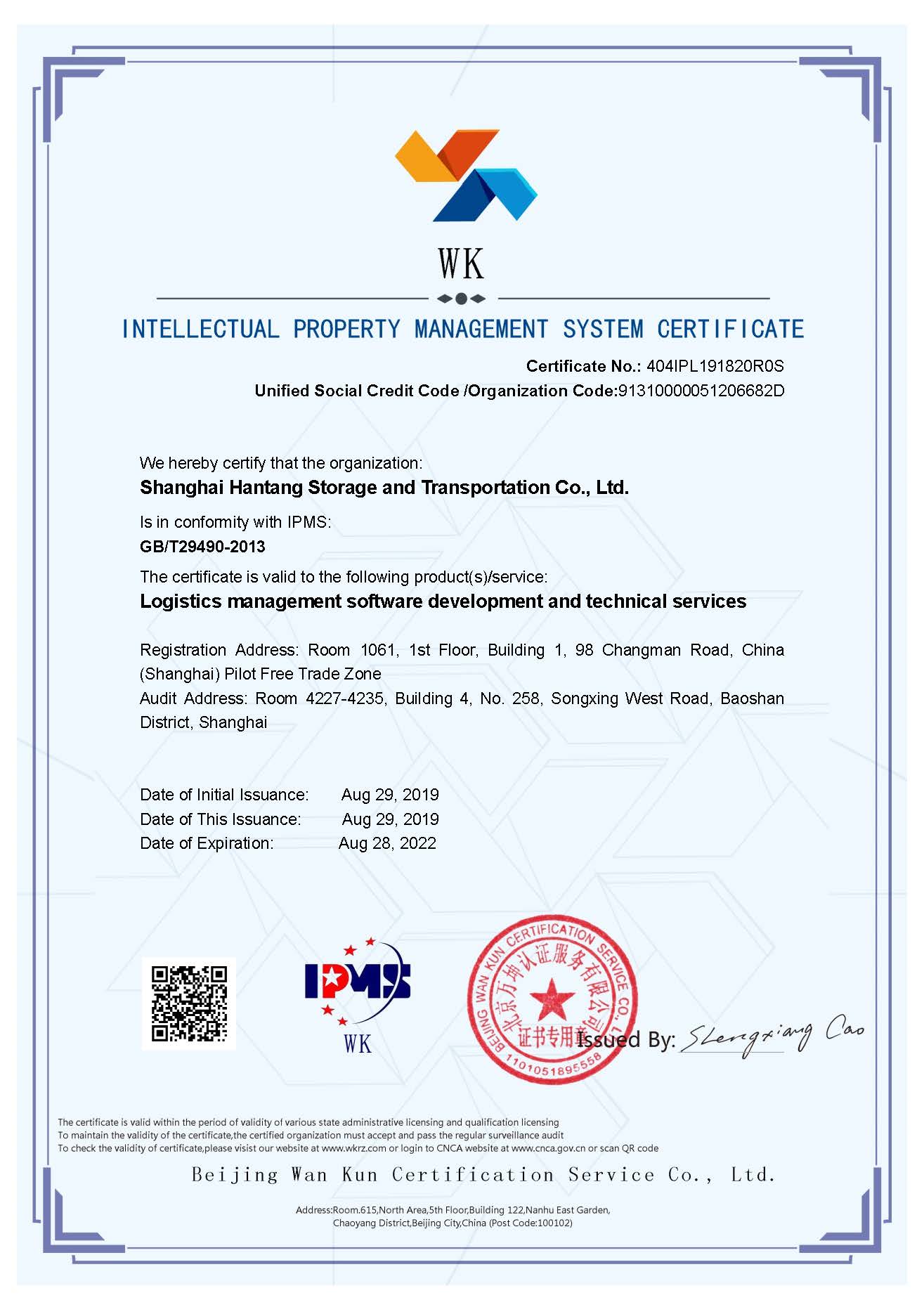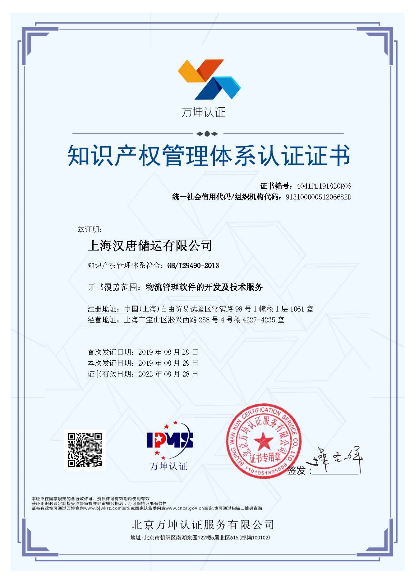 2019年8月29日,汉唐物流下属子公司上海汉唐储运有限公司获“知识产权管理体系认证证书”
